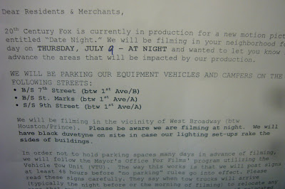 According to the posted signs... the crew will be parking their "vehicles and campers" (woo! cookout!) on Seventh Street between First Avenue and Avenue B, St. Mark's between First Avenue and Avenue A, and Ninth Street between First Avenue and Avenue A.