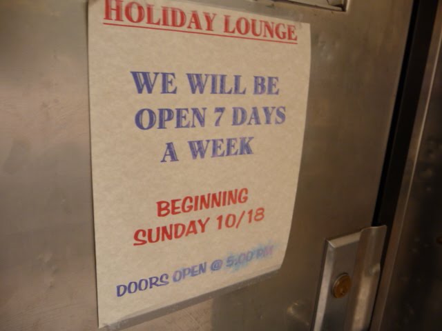 Oops! Meant to post this about 6-7 weeks ago! In any event, good news. Cheesy promotions aside (and we understand you need to make some money), we're pleased that the Holiday is back on a seven-day-a-week schedule. After Stefan's death earlier this year, there were questions his family would even keep the bar going... Soon enough, the Holiday was open just on the weekends. Then, in April the bar expanded its hours to Wednesdays and Thursdays. So here's to a great place to drink Mondays and Tuesdays now... and any other day, really.