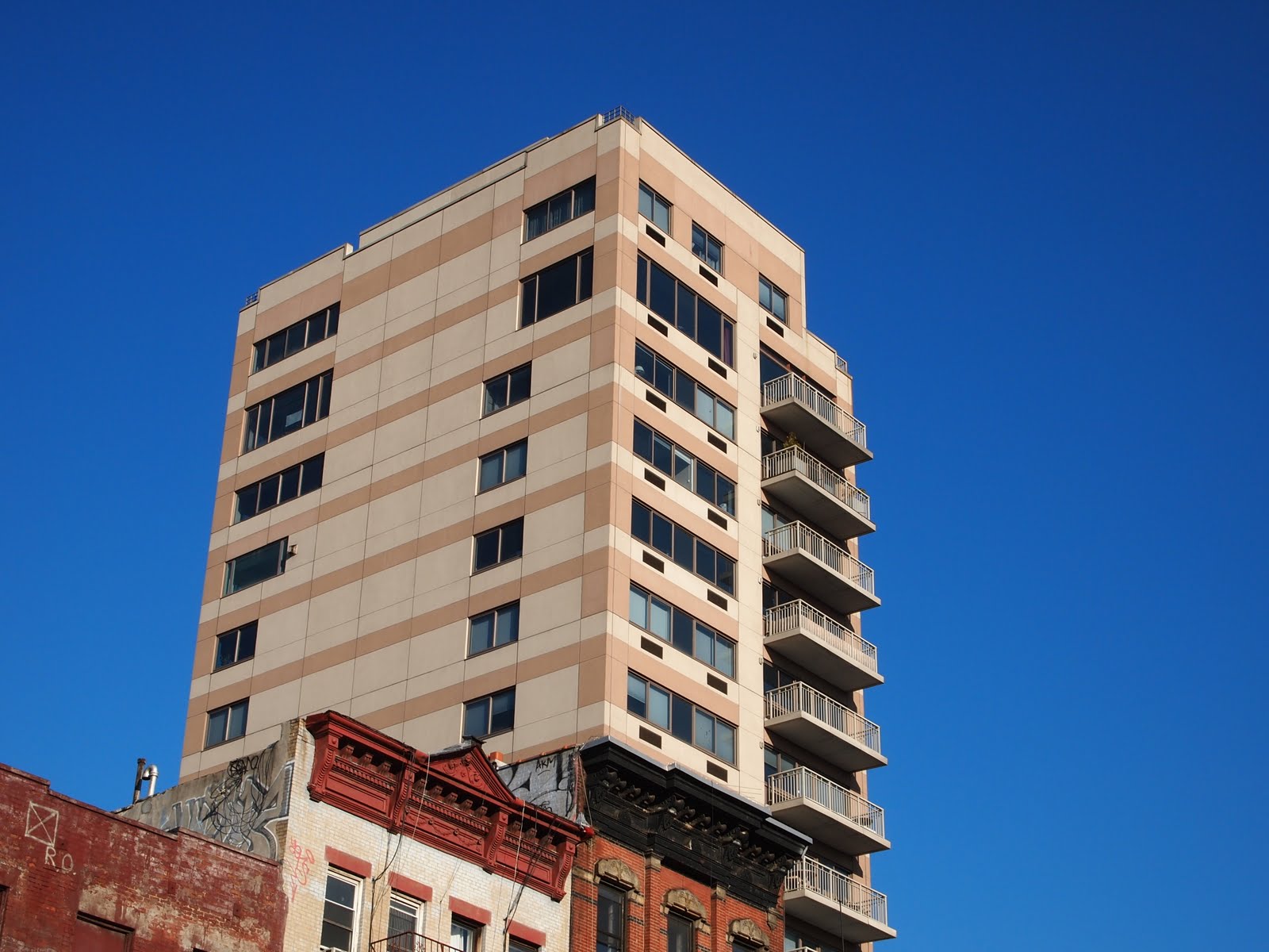 The NYU dorm behind the church facade on E 12th between 3rd and 4th.