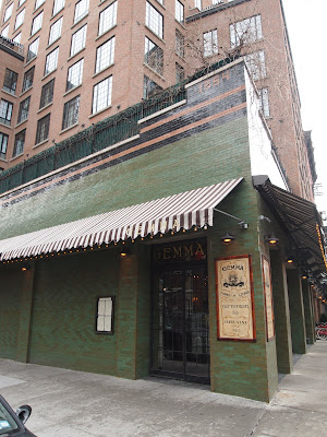 The bank was purchased by L.B. Oil Company, which replaced the building with a filling station and garage that was built in 1955 (not 1954!), designed by an engineer named Herman Kron. The garage/Gemma building appears to have been reworked and refaced with a glazed brick veneer; the choice of date is wrong in two respects: it is neither the date of the earlier garage, nor the date of the restaurant. It is likely the year the magnificent Leopold Eidlitz-designed Victorian Gothic building was demolished.