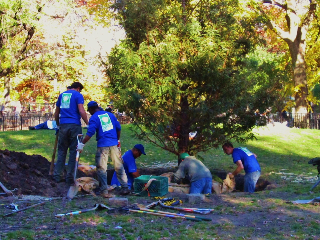 Yesterday afternoon, workers from Bette Midler's New York Restoration Project planted this Dawn Redwood tree... A worker told EV Grieve reader peter radley that, yes — this tree will be dedicated to Steve Jobs... (We also reached out to the NY Restoration Project for comment...)