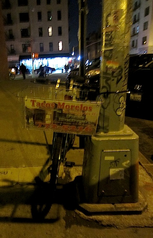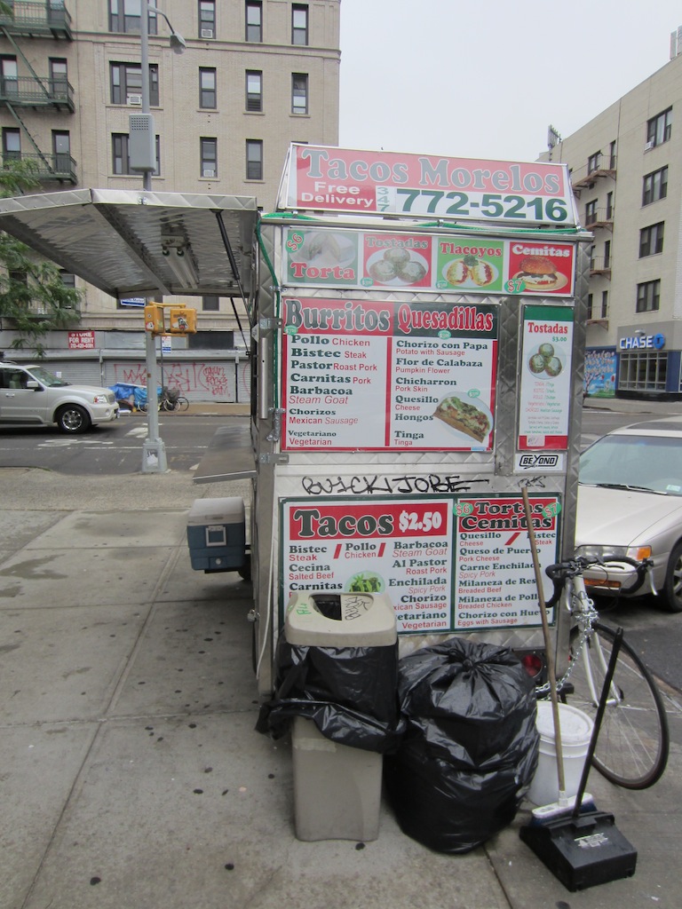 The truck on 2nd Ave and 4th St is Idolo, not Morales. The menu is better at Idolo, at least if you like organ meats, but we really have to patronize both. Or I do, at least.