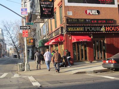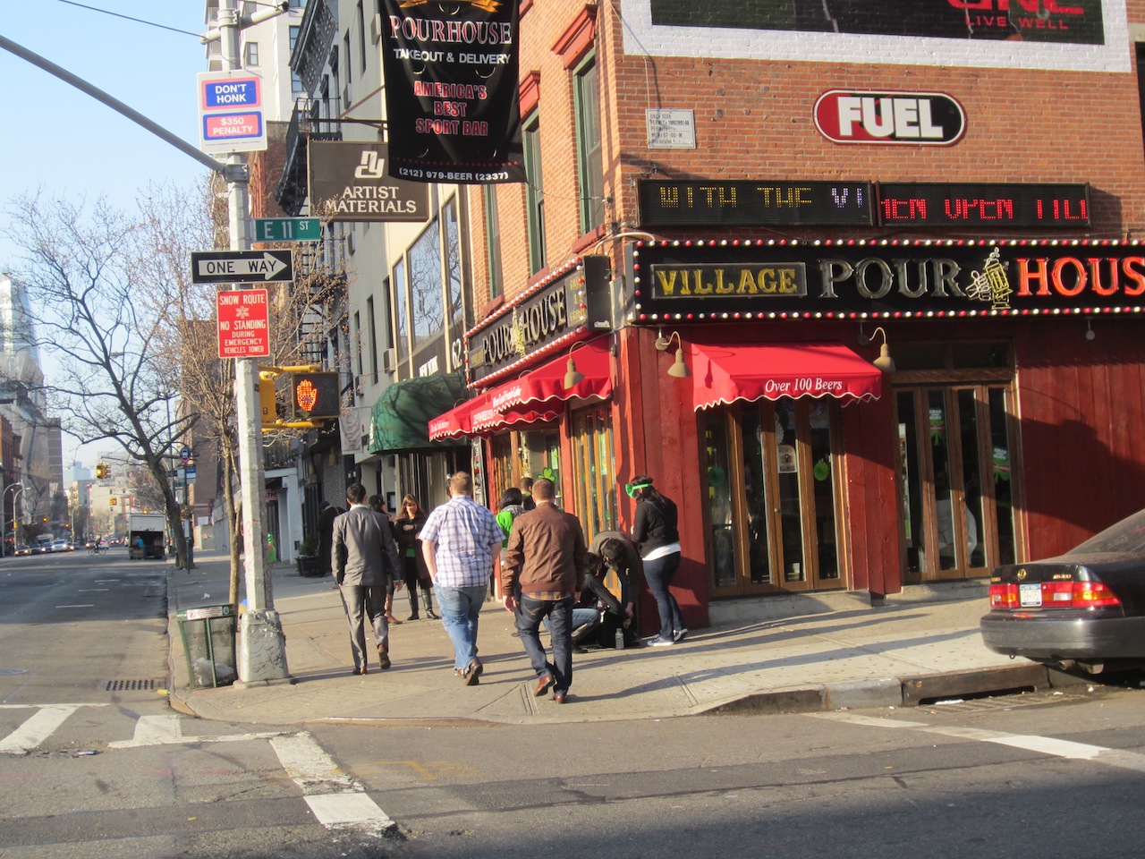If you don't feel like waiting, then you may go to the Village Pourhouse on 11th Street and Third Avenue. They were open earlier. You may need a backpack to get in. Many people we saw entering the bar had backpacks. (Unfortunately, not depicted so well in this photo...) Change of clothes? Provisions? Textbooks? Stomach pumps?