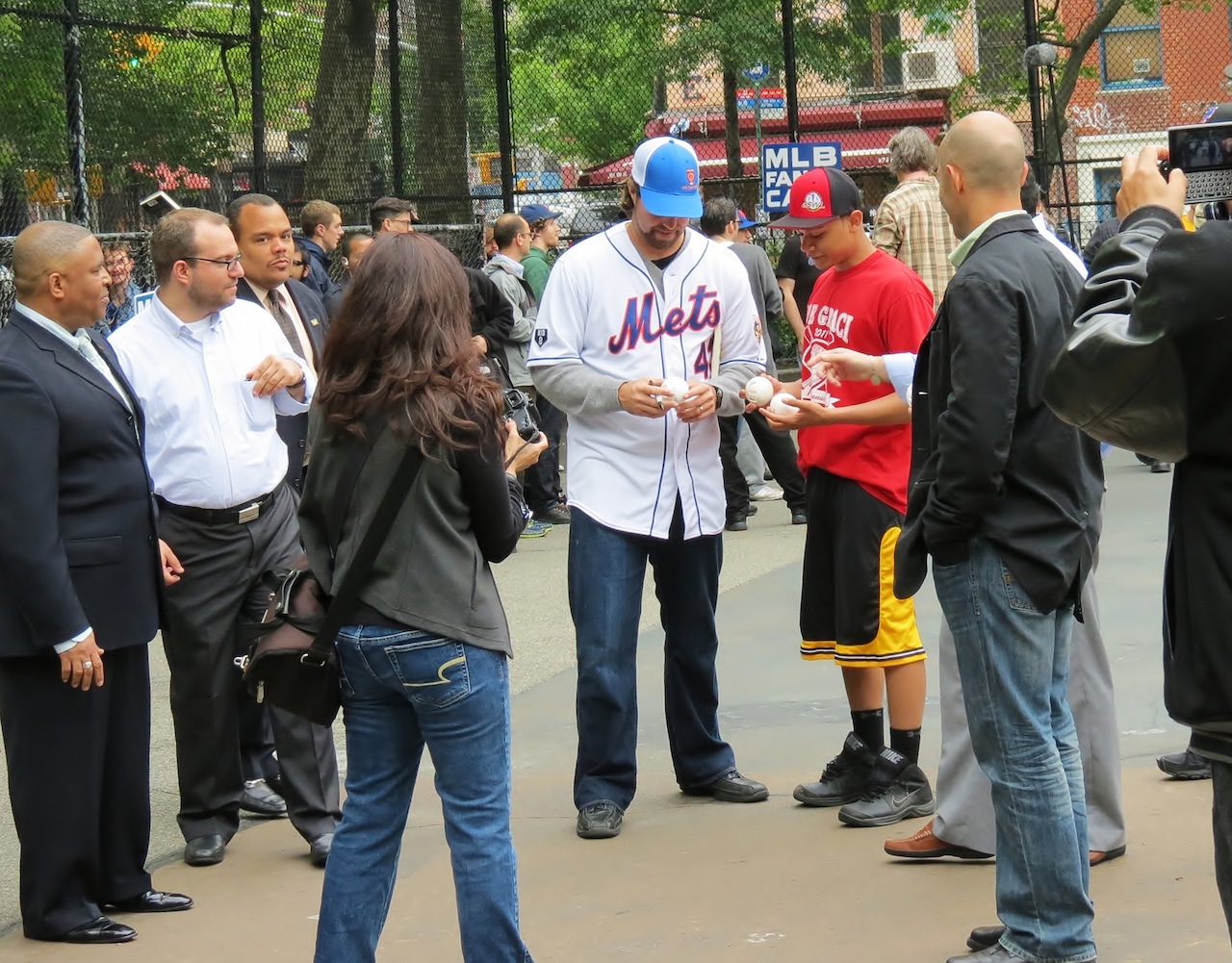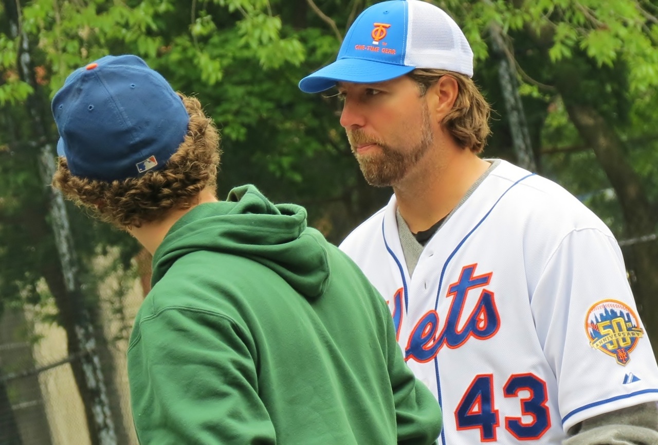 This afternoon, for some reason, New York Mets knuckleballer (and all-around-nice-guy) R.A. Dickey was in Tompkins Square Park to watch people throw Wiffle balls... and interact with kids. And adults.