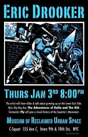 The Museum of Reclaimed Urban Space (MoRUS) will welcome 2013 with an artists salon giving voice to the very history the museum seeks to preserve. Eric Drooker, Fly Orr and beat-rhyming duo The Adventures of Kaila & the Kid will participate in this one-night-only event on Thursday, January 3, beginning at 8 PM. MoRUS is located at 155 Avenue C between 9th and 10th Streets. This is the museum’s first membership drive event since officially opening on December 8, and the event is free and open to the public.