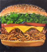 Robinson's work visualizes the idea of indulgence, both in terms of contemporary consumer appetites and in reference to the religious practice by which sins can be forgiven. Using a straightforward illustrative style, he presents pop culture images of cheeseburgers, alcoholic beverages and other comestibles, as well as pin-ups (both female and male), pharmaceutical products, portraits of celebrities, and paperback images of romance and drama.