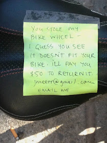 Resident offers $50 for the return of stolen bike wheel on East 10th Street