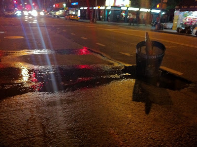 Uh-oh! Run! Or walk briskly! Dave on 7th reports that a sinkhole is growing (or getting deeper) here on Avenue A between East Third Street and East Second Street ...