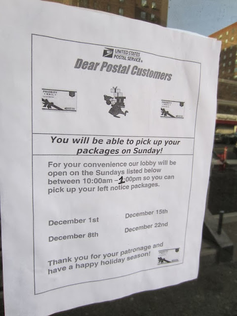 The Sunday hours continue this month at the Peter Stuyvesant Post Office on East 14th Street. (And apparently not everyone could agree on the hours, as you can see that 2 p.m. got changed to 1 p.m.)