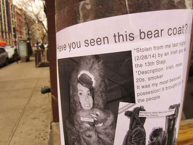 Any idea if Sabrina's boyfriend is that guy seen walking around Tompkins Square Park in a chicken suit last week? If it is just look for a very large chicken walking around the Village with a bear coat, shouldn't be too hard to find.