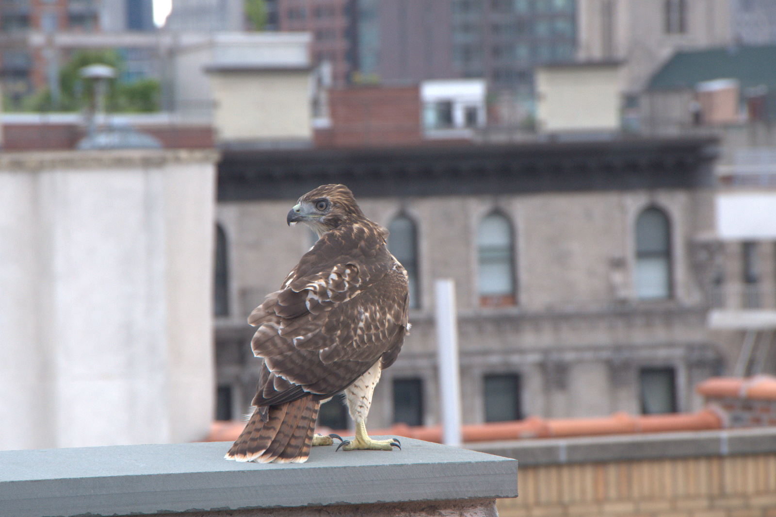 One of the hawks joined a rooftop fireworks viewing party on East Eighth Street.