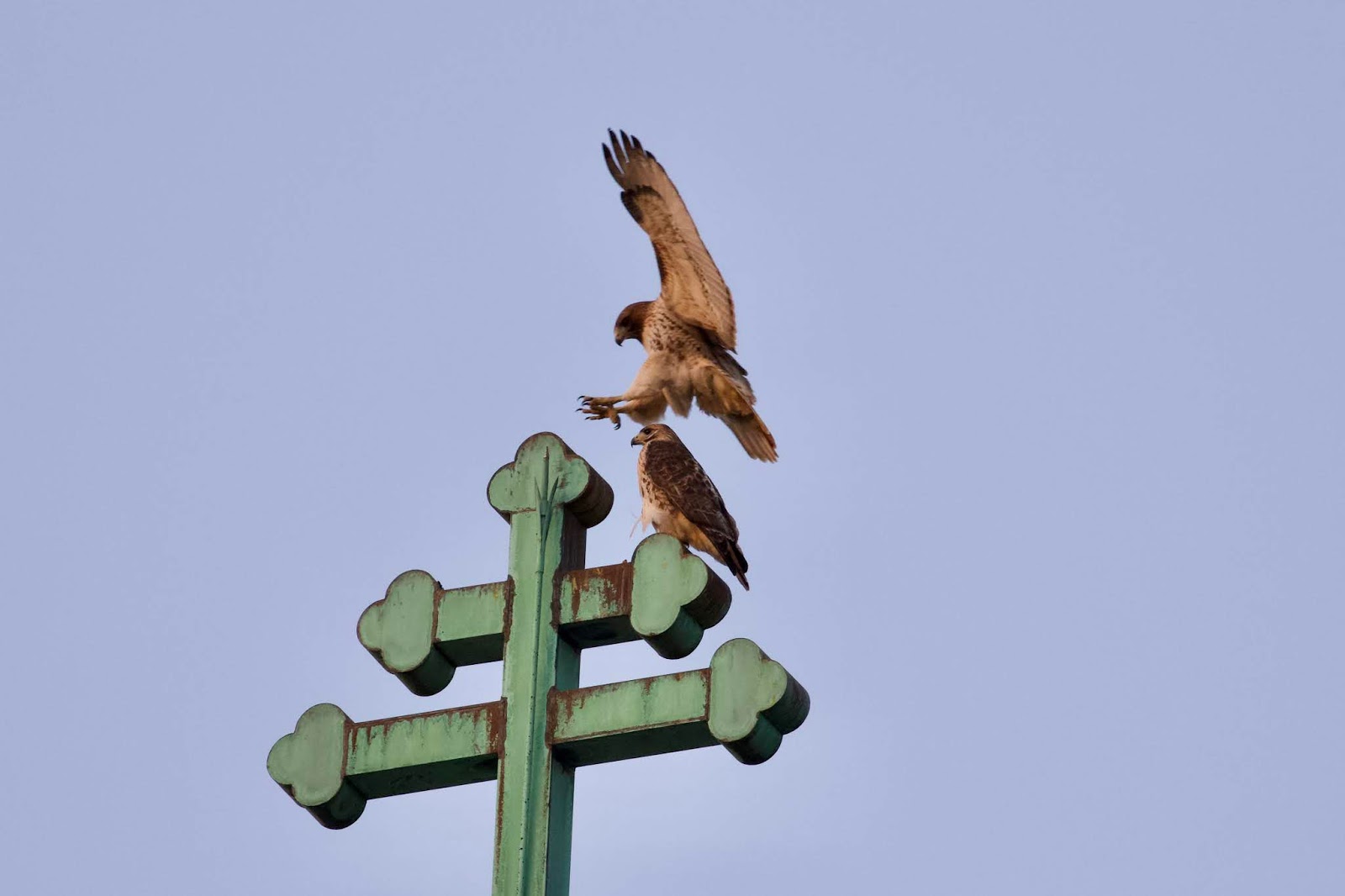 Amelia (landing) and Christo, the red-tailed hawks of Tompkins Square Park, were out enjoying the nice weather today. Steven took this photo of the hawks atop St. Nicholas of Myra Church on 10th Street at Avenue A.