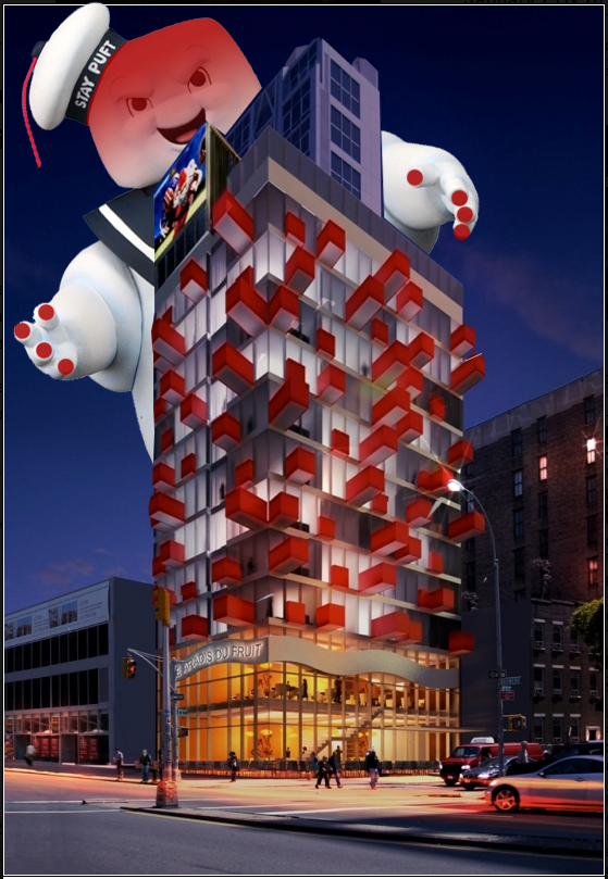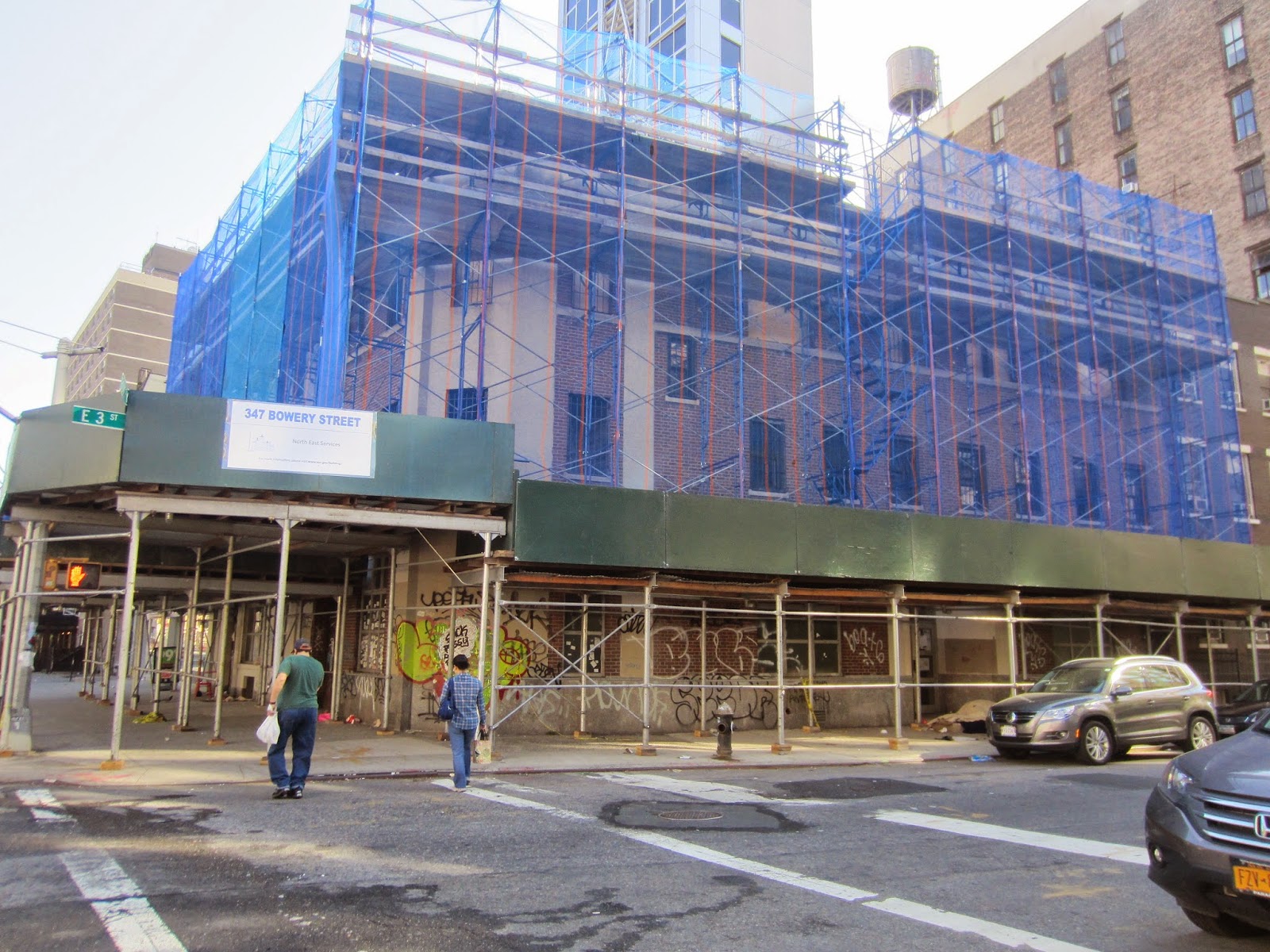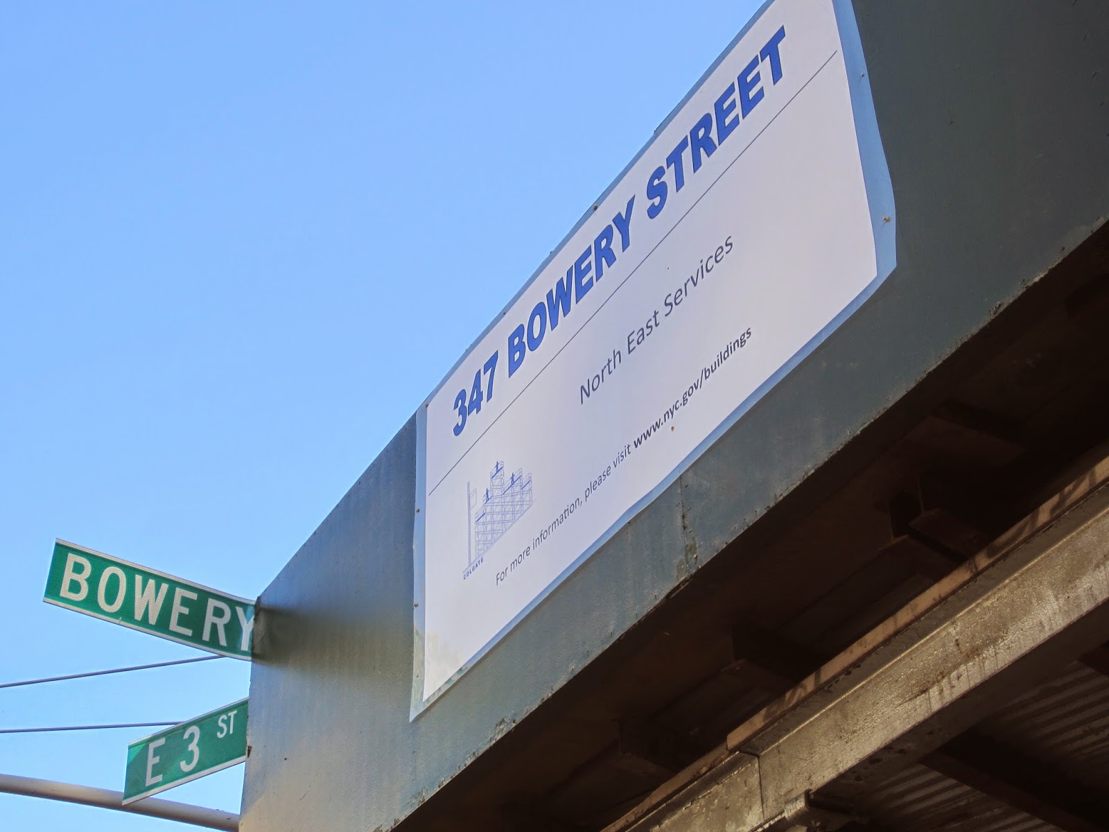 The last time that we checked in on 347 Bowery in March, a cheap Penistrator knockoff saw fit to degrade the renderings on the plywood here at East Third Street by drawing a large [redacted].