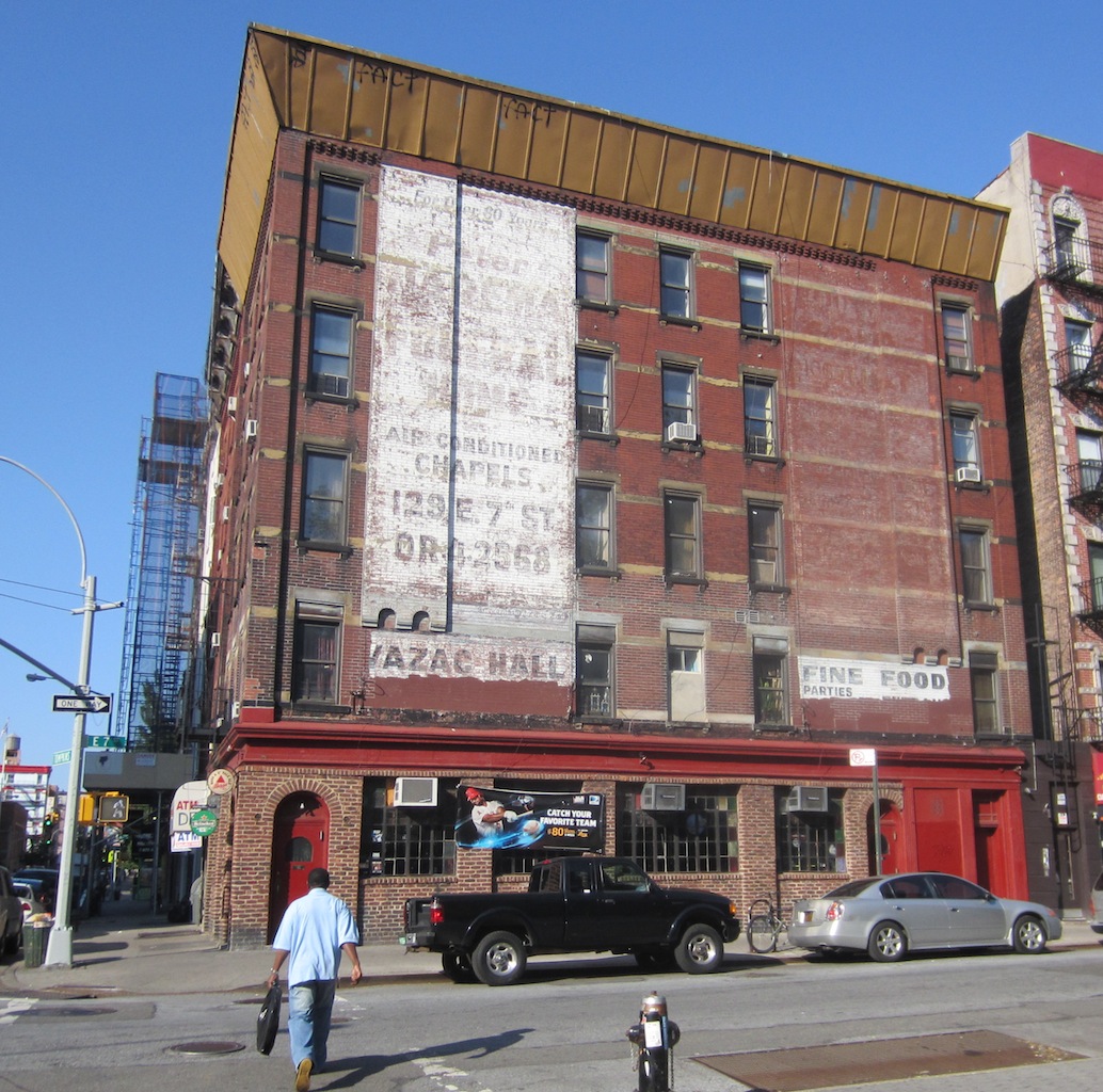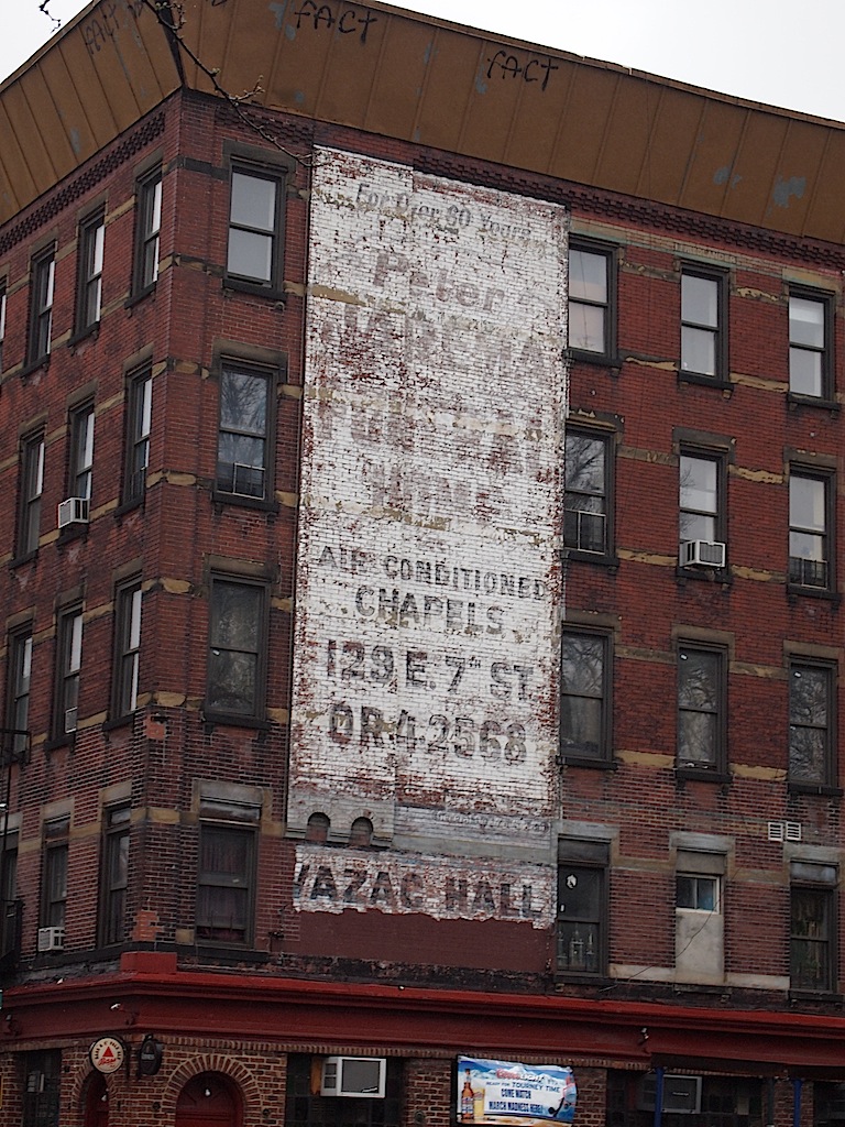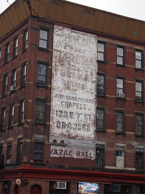 During exterior renovations last June (first reported here), workers sandblasted away the former ad for the funeral home that's on Seventh Street between Avenue A and First Avenue.