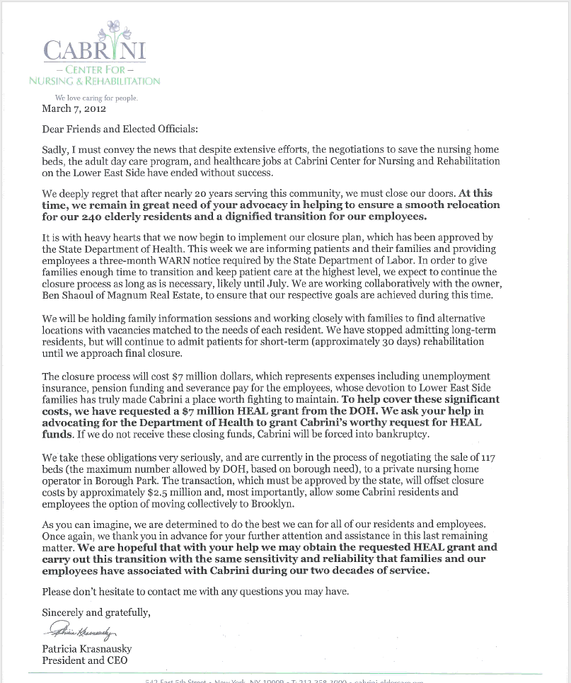 Ongoing negotiations to preserve the Cabrini Center for Nursing and Rehabilitation on East Fifth Street at Avenue B have been unsuccessful. According to an anonymous source, Cabrini has run out of options and will close its doors in four to five months. During this time, Cabrini officials will find new homes for its residents as well as placement for current day-care clients.