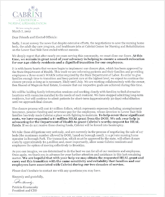Your statement that we would not grant an extension so that Cabrini could build a new facility on land provided by the Archdiocese isn't quite correct. We were willing to consider something, but Cabrini turned out not to be able to move forward with it. We also at their request attempted to sell the building to a for profit operator at their request who turned out not to be able to perform. It was only after those alternatives failed that we advised Cabrini that no extension would be granted. Please bear in mind that this situation was created when the previous seller decided to sell ad set a price that Cabrini couldn't meet. We attempted to work with them in good faith.