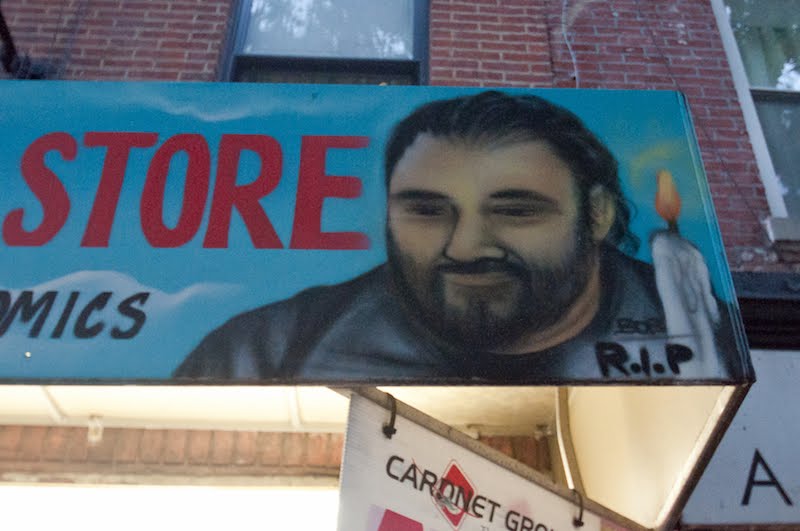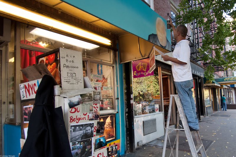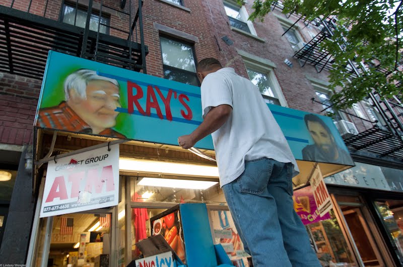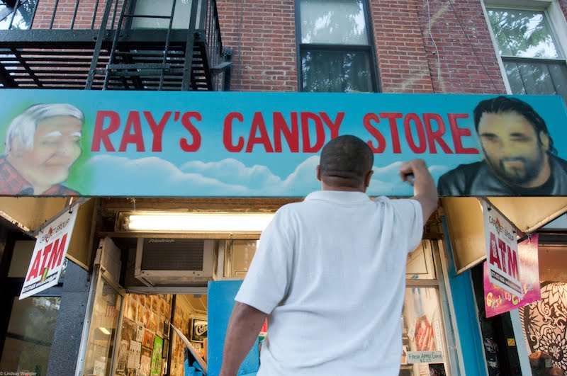 Yesterday after, we posted photos of Chico working on a mural for the Ray's Candy Store awning on Avenue A ... Single Linds Reflex, who worked with Chico on the concept, was there to watch it happen ... Here's a sort of Blogger time-lapse with the final work ...