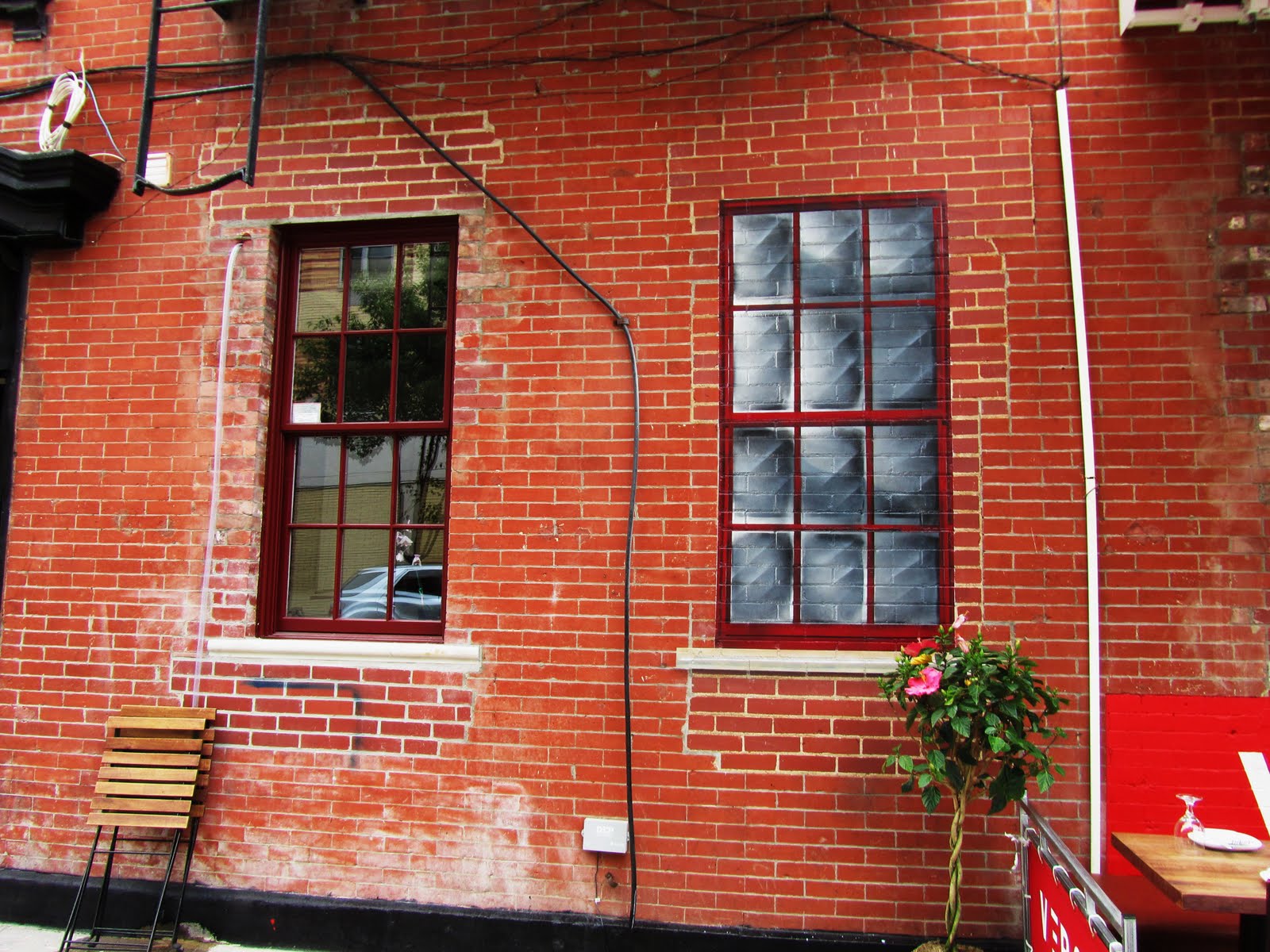 On Monday, EV Grieve correspondent Bobby Williams noticed that someone had painted a window on the outside wall between two existing windows at Verso, the Italian restaurant that opened last month on Avenue C at Eighth Street... (Chico was on the scene too, though we're unsure if he was there to lend a hand or just passing by...)