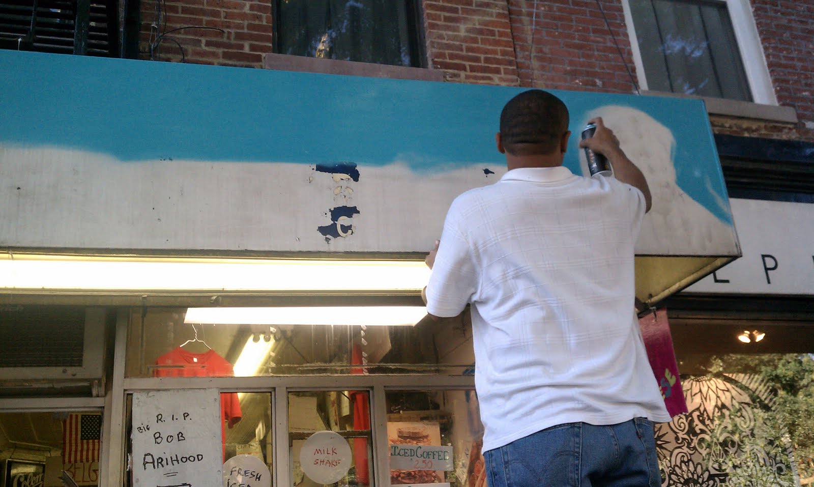 Chico creating a mural honoring Bob Arihood at Ray's Candy Store