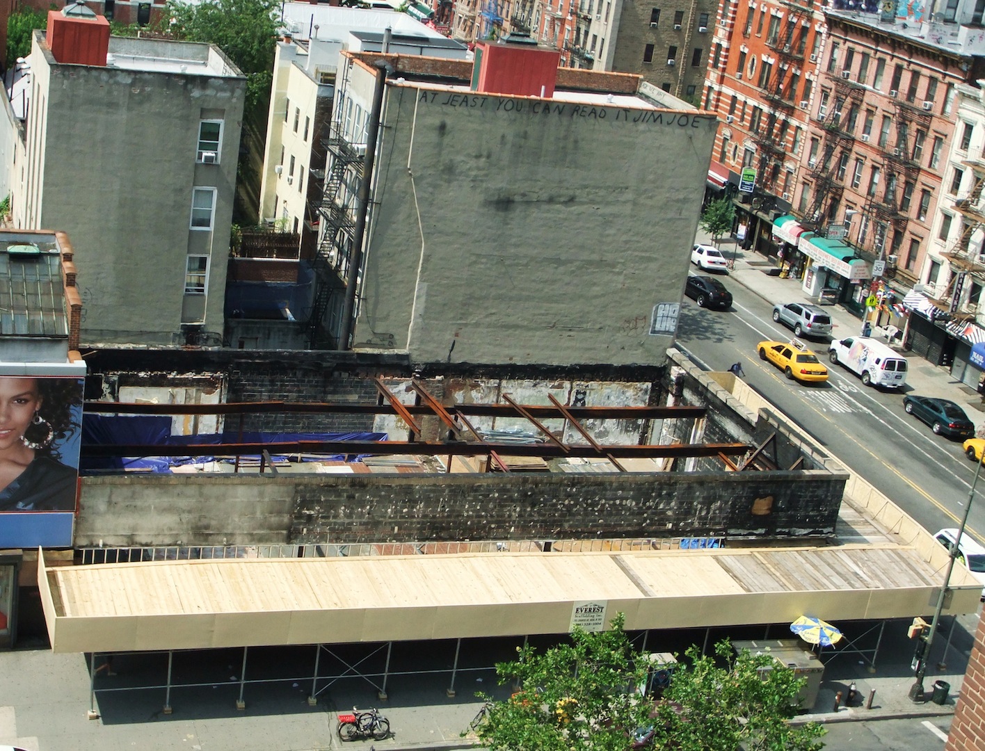 Chico (on a break at the moment the photo was taken) and company are painting over this ad on Houston at Avenue B... as you can see, someone has defaced the mural...