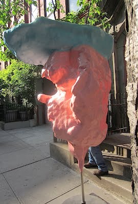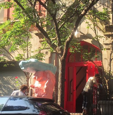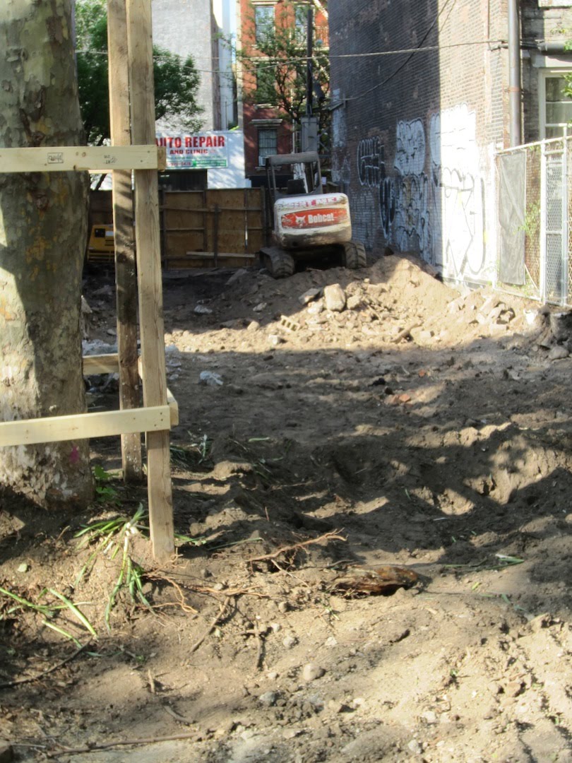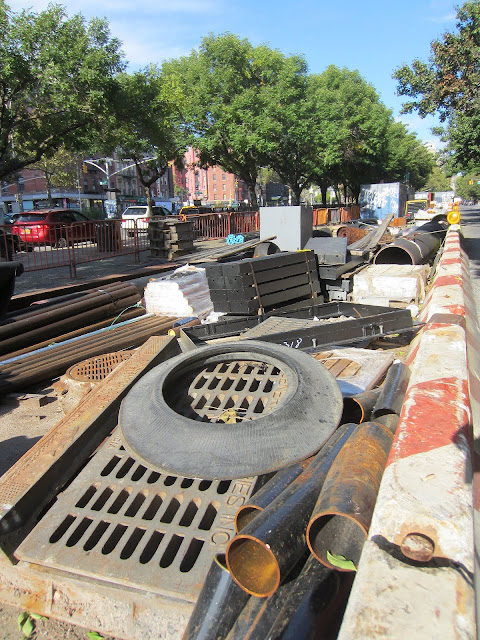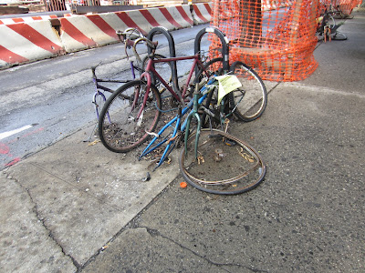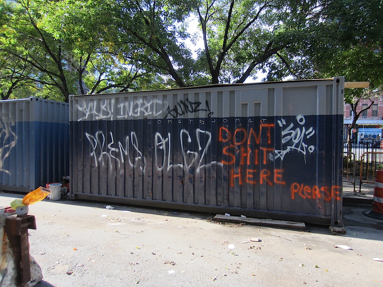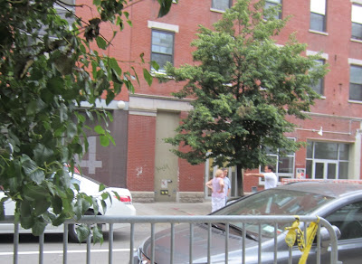 While the sidewalk bridge was up, multiple people started living in encampments along the First Street side... (Earlier this year, the Daily News reported on one of the women who was living along here. Her pitbull reportedly bit a man who was tormenting her.)