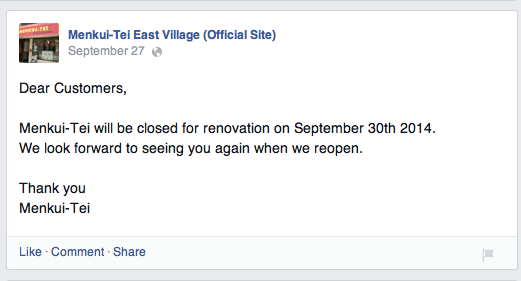 A message on Menkui-Tei's Facebook page states the following…