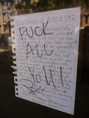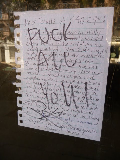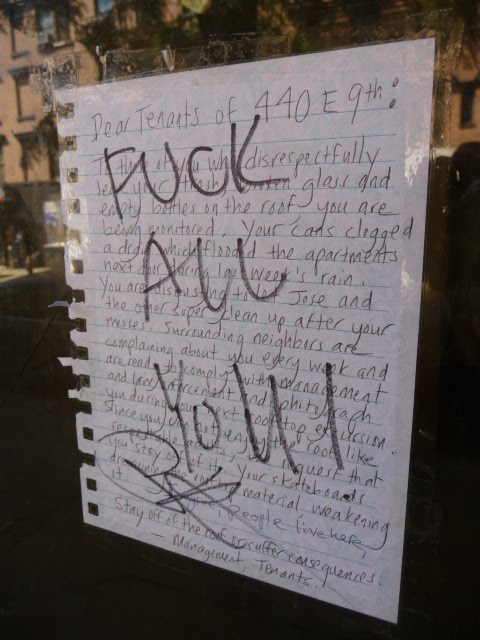 "To those of you who disrespectfully leave your trash, broken glass and empty bottles on the roof, you are being monitored. Your cans clogged a drain which flooded the apartments next door during last week's rain. You are disgusting to let Jose and the other super clean up after your messes. Surrounding neighbors are complaining about you every week and are ready to comply with management and law enforcement and photograph you during your next rooftop excursion. Since you can not the enjoy the roof like respectable adults, we request that you stay off of it. Your skateboards are ruining the rooftop material, weakening it."