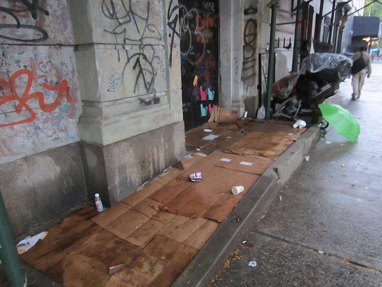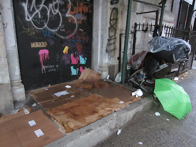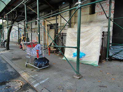 Meanwhile, we do know what has been going on with the former school, at least on the East 10th Street side: Some folks have created temporary housing under the sidewalk bridge...
