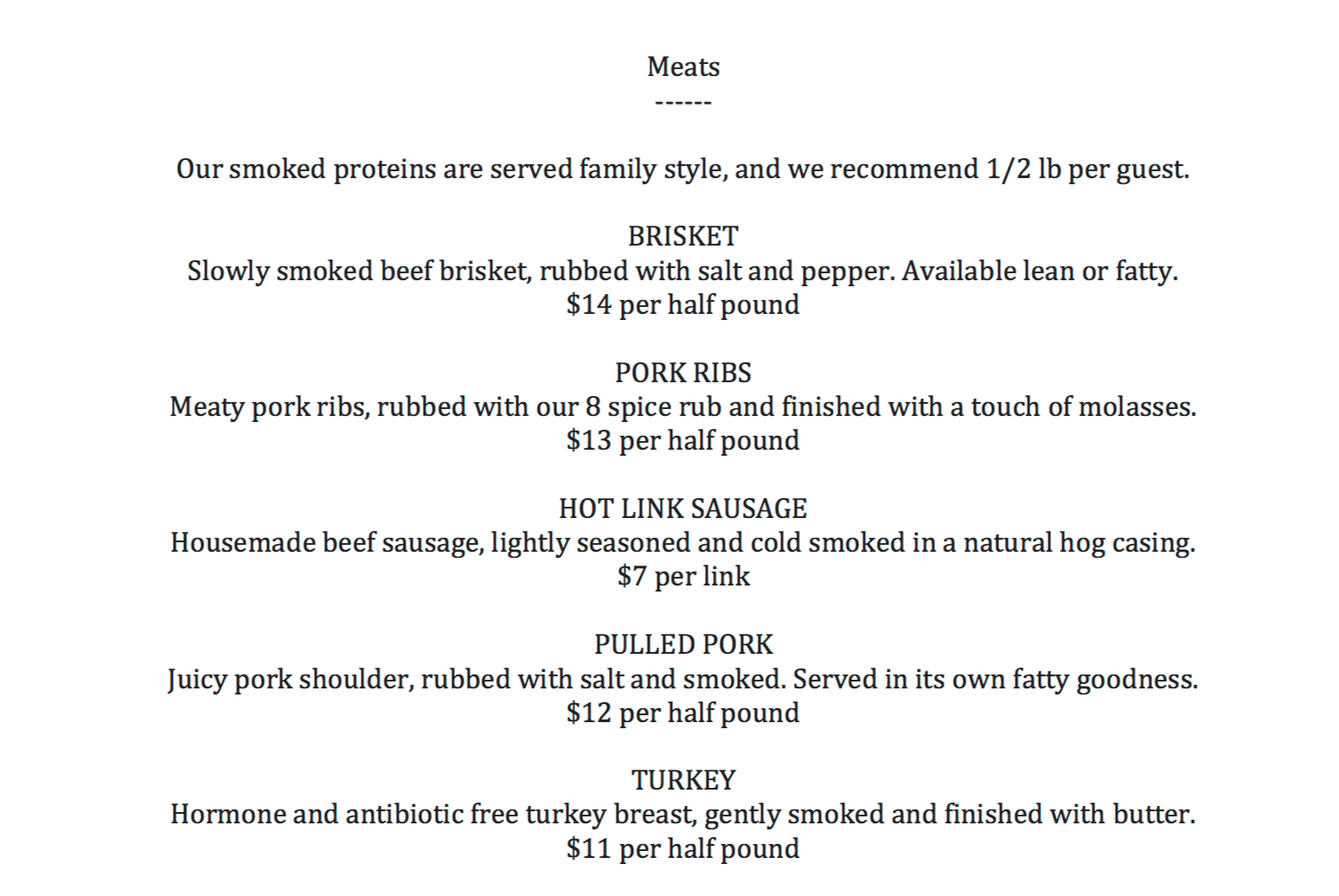 There's also a proposed menu showing the variety of meats (served family style, Delaney is recommending a half-pound per guest...) and sides that might be served...