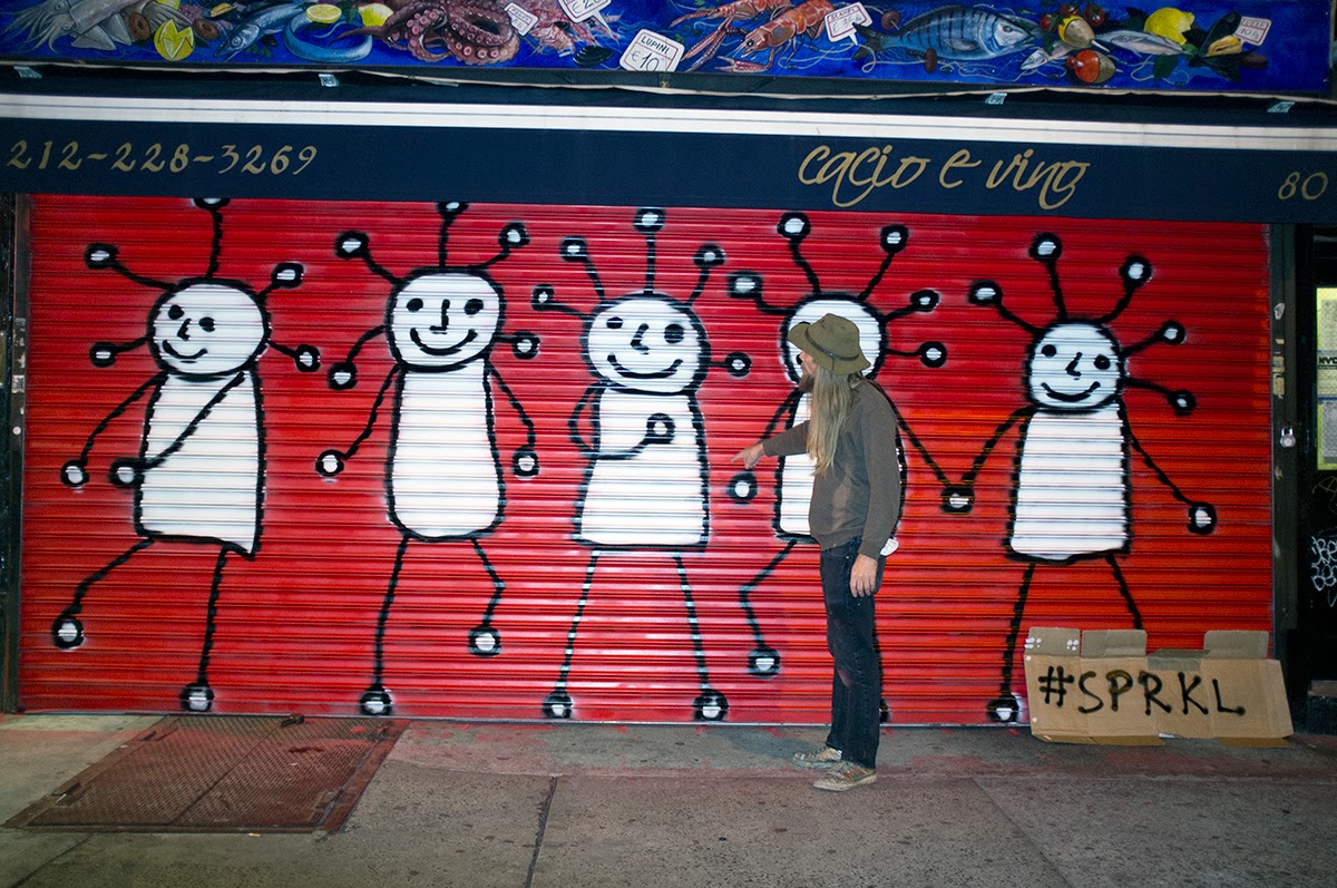 Last night, local musician-artist-folk hero Paul Kostabi added some art — specifically his character sprkl — to the roll-down gate at 80 Second Ave.