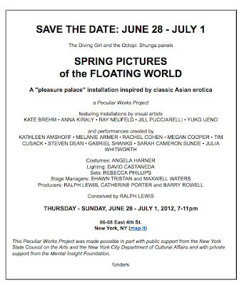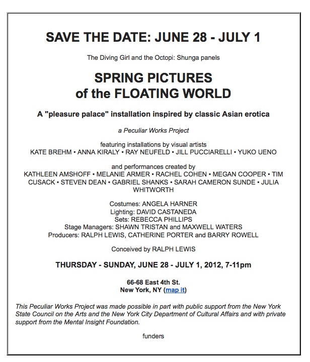 Peculiar Works Project announces a new site-specific sextravaganza: Spring Pictures of the Floating World (and Art of the Bedchamber), a two-part performance art installation, reimagining 17th Century Japanese Shunga — pillow books — and their 5,000-year-old Chinese inspiration.