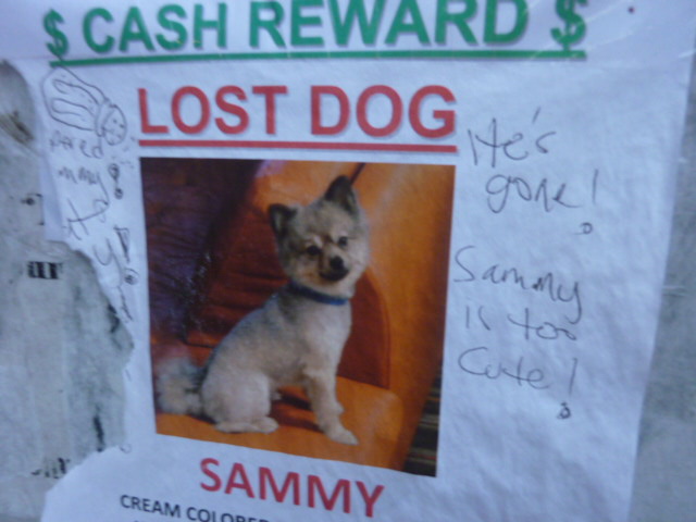 Speaking of Sammy... As far as I know, Sammy is still missing. (I recently saw a Craigslist ad offering the cash reward.) I continue to see new flyers too.