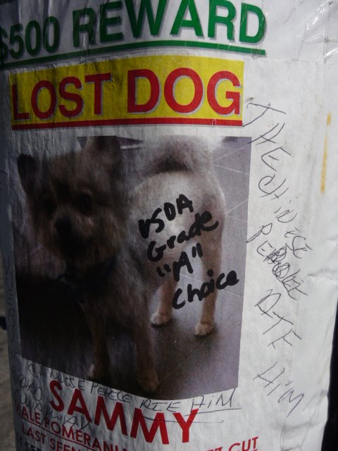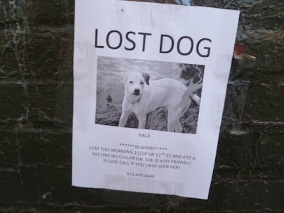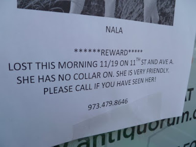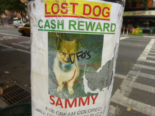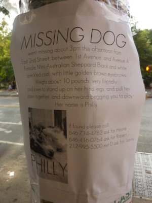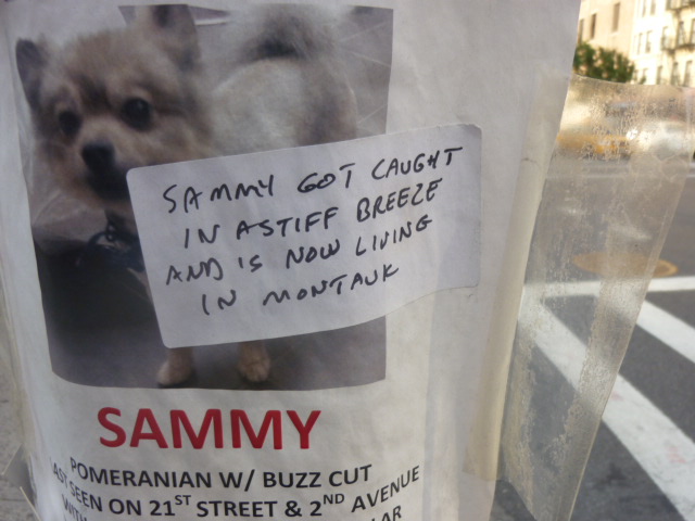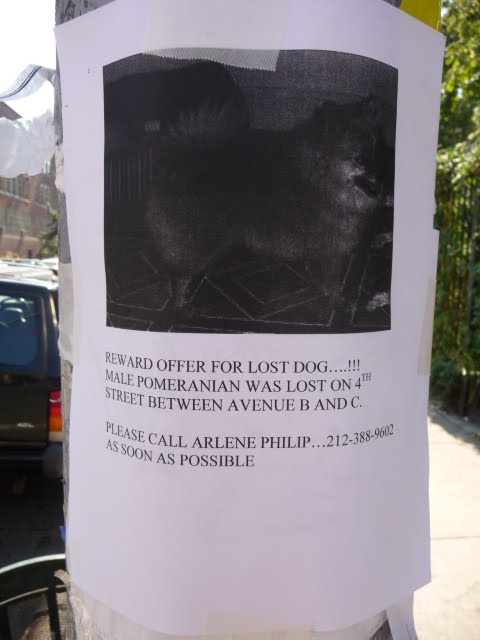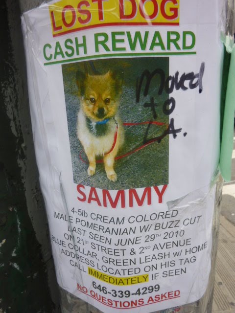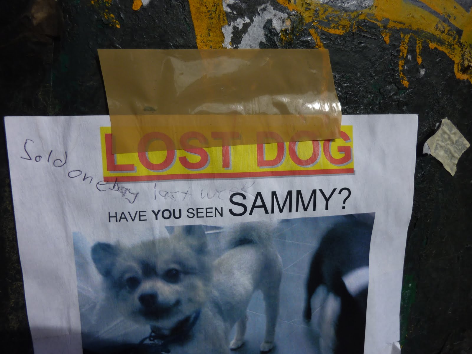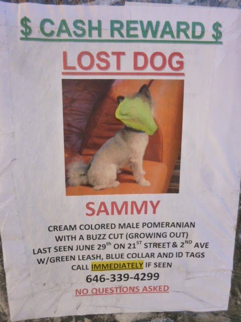 Last evening, we posted information about a missing dog on 11th Street and Avenue A... Meanwhile, we couldn't help but notice new Sammy flyers around Tompkins Square Park this past week...
