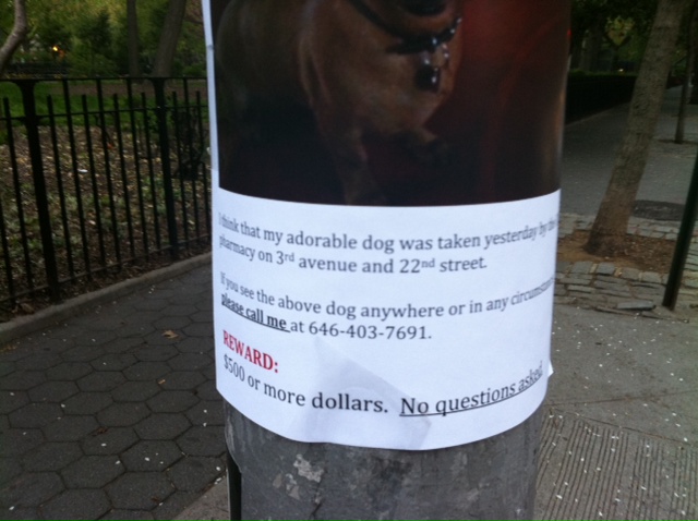 According to the fine print, the pup was stolen by the CVS on Third Avenue and 22nd Street. The owner doesn't mention the dog's name... and there is a $500 "or more" reward.