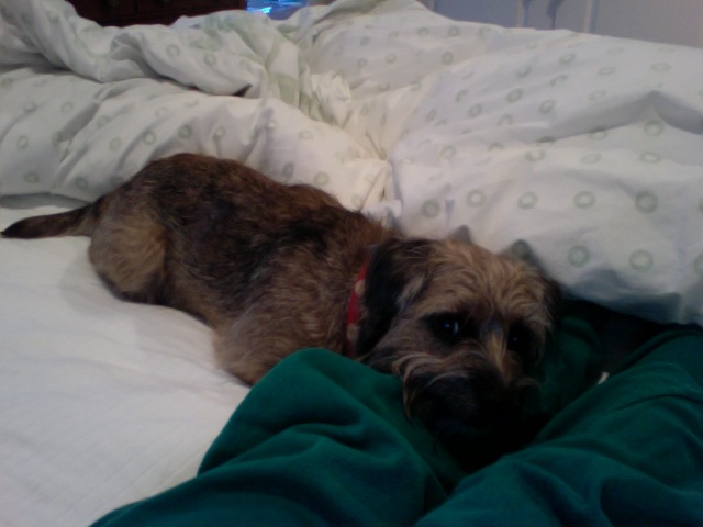 A dog walker named Beth saw her with a homeless guy sleeping in a park. She recognized Eloise from the poster that I posted at the Tompkins Square Dog Run. She waited for him to wake up before she asked him if he had recently found her. He was very friendly and excited to help Eloise find her owner. She called Home Again (Eloise has a microchip) and gave them her number, which was on the poster. Since he didn't have a phone, he let her take Eloise, albeit sadly and reluctantly. In the meantime, Home Again called me and gave me her number. I was already at Rivington and Orchard after following the lead from the e-mail you forwarded me, and she was at Rivington and Norfolk. So I walked toward her, and she was waiting for me with Eloise in front of Café Luise. I also got to meet the guy who had initially taken her ... He was very worried about her and told me he fed her a ham, tomato, and bread sandwich. He ... couldn't have been more concerned about finding me. She has been sleeping since we got home a couple hours ago.