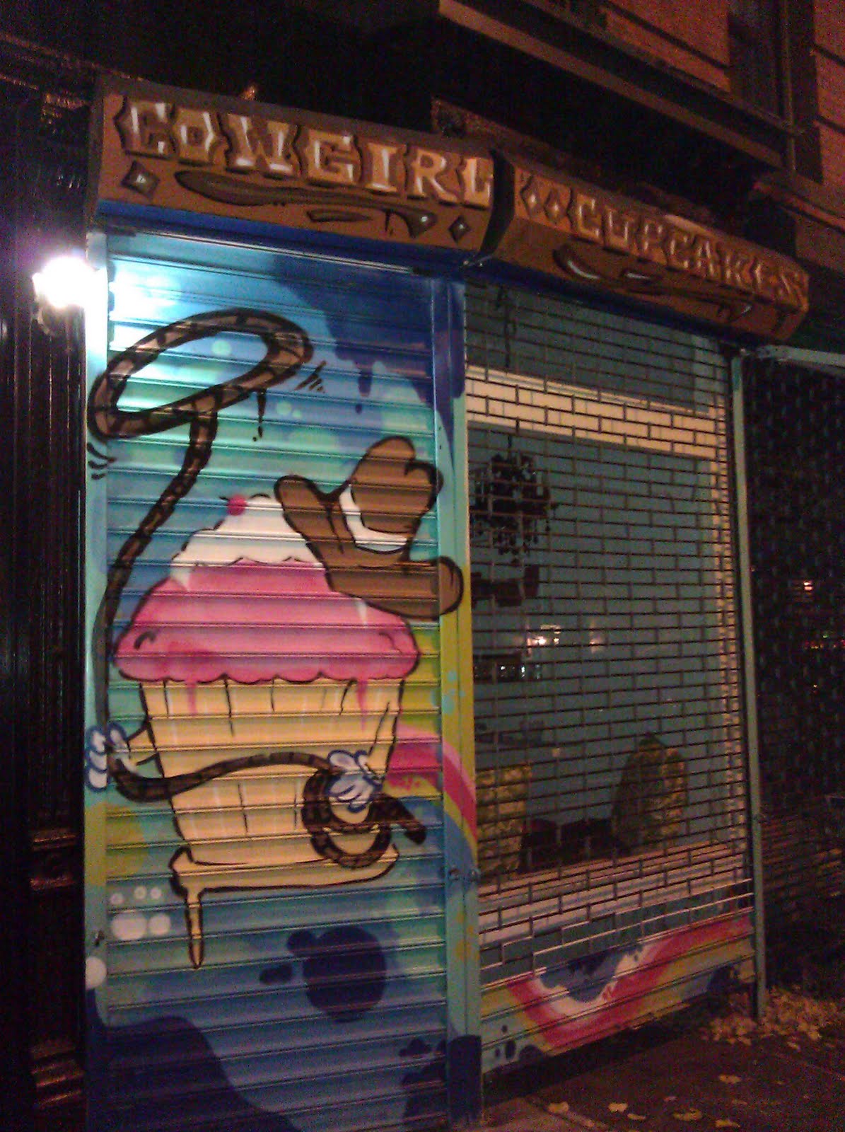 Thanks to EV Grieve reader Leesy for this shot of Cowgirl Cupcakes coming to East 10th Street between Avenue A and First Avenue. No word on an opening date... And I do like the art on the roll-down gate. Maybe it's the image makeover that the often-maligned cupcake needed?