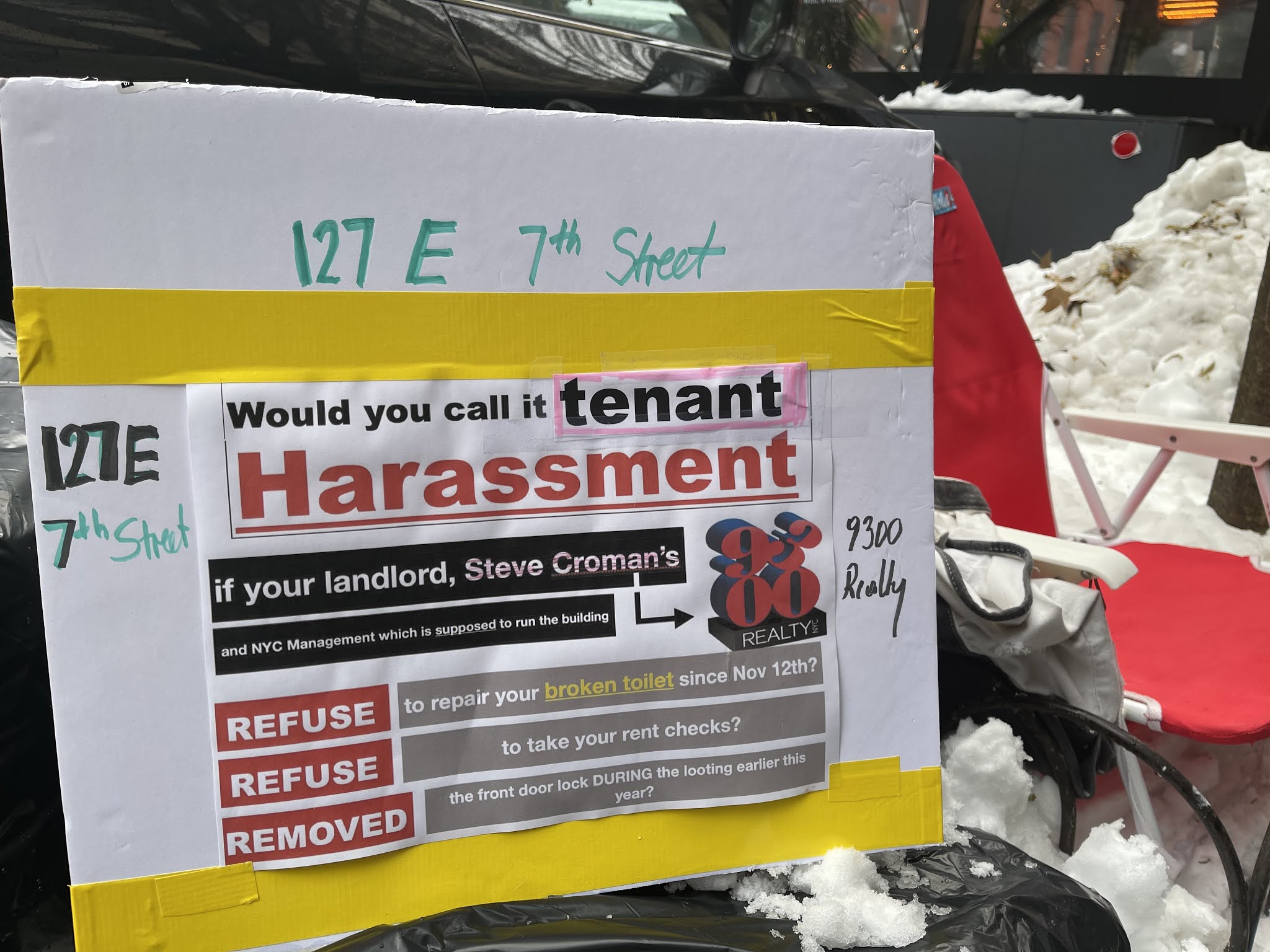 Hasler, a public high school teacher who has been working remotely, and his roommate, Brian Kenner, have not had a properly working toilet since Nov. 12 ... the latest indignity on behalf of the building's landlord, Steve Croman ... which prompted Hasler to launch a one-man protest outside No. 127 on Sunday.