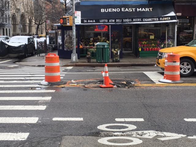 Anyway, EVG reader John Iz shared these photos showing the developments here this past week... and the DOT's various attempts to warn vehicular traffic of the hole in the Avenue...
