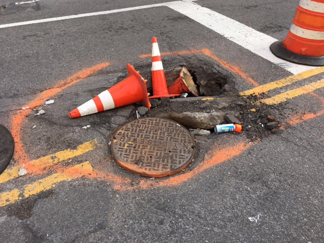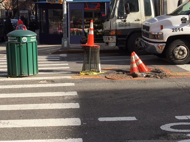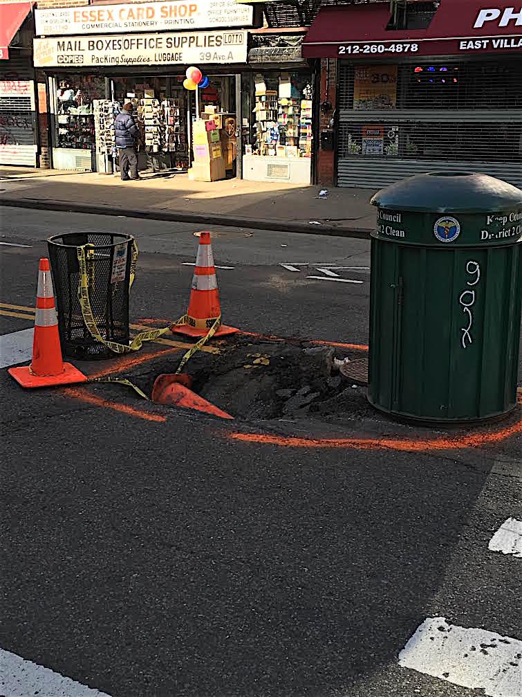 Last Sunday, we noted the sinkhole in the works on Avenue A at East Third Street. It had already eaten a pylon, and was on its way to becoming a rare 5 Pyloner