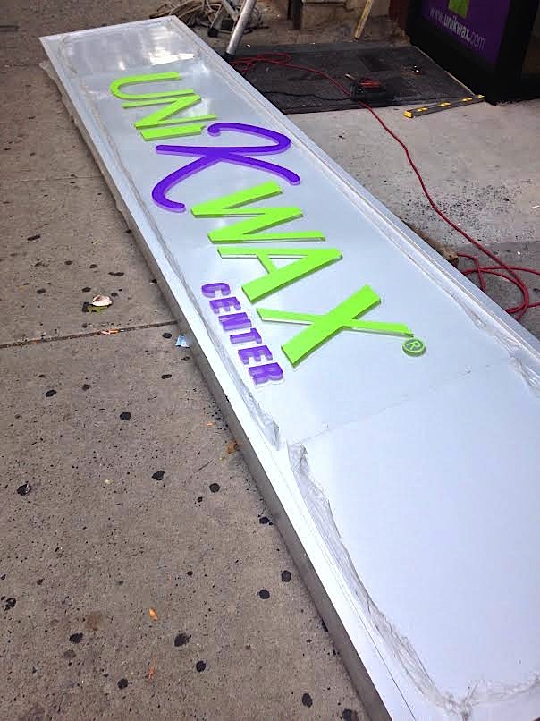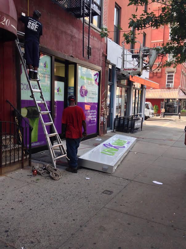 This morning, crews are carefully putting into place the Uni K Wax Center signage here at 120 Second Ave. near East Seventh Street... behold the pleasing lime green-violet color combo...