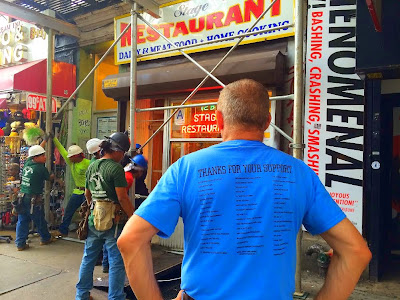 He had to helplessly watch for some 20 minutes while the crew blocked the door to the restaurant to build the safety structure, as these photos by EVG reader Jonathan Jones show.