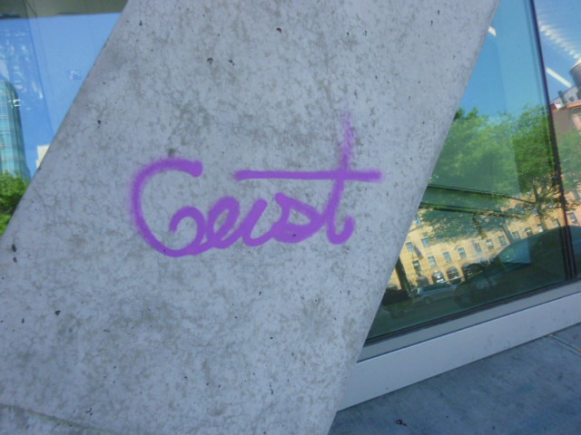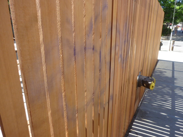 On Wednesday, workers finished putting in the Popsicle fence at the Cooper Square Hotel... a tempting canvas for street artists... and sure enough, in what will be the first of many, I imagine... someone tagged the fence last night... and thanks to EV Grieve reader Ryan for snapping this shot early this morning of the Cooper Square Hotel Anti-Graffiti Team going into action...