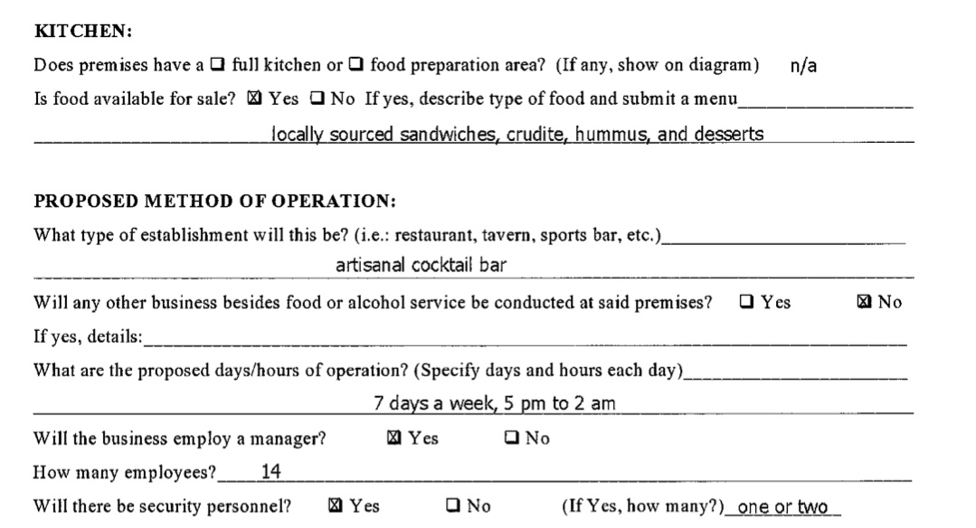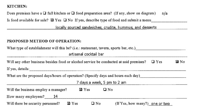 As you can see from the screengrabs below, the place is being described as an "artisanal cocktail bar" that will, aside from cocktails, serve "locally sourced sandwiches, crudite, hummus and desserts."