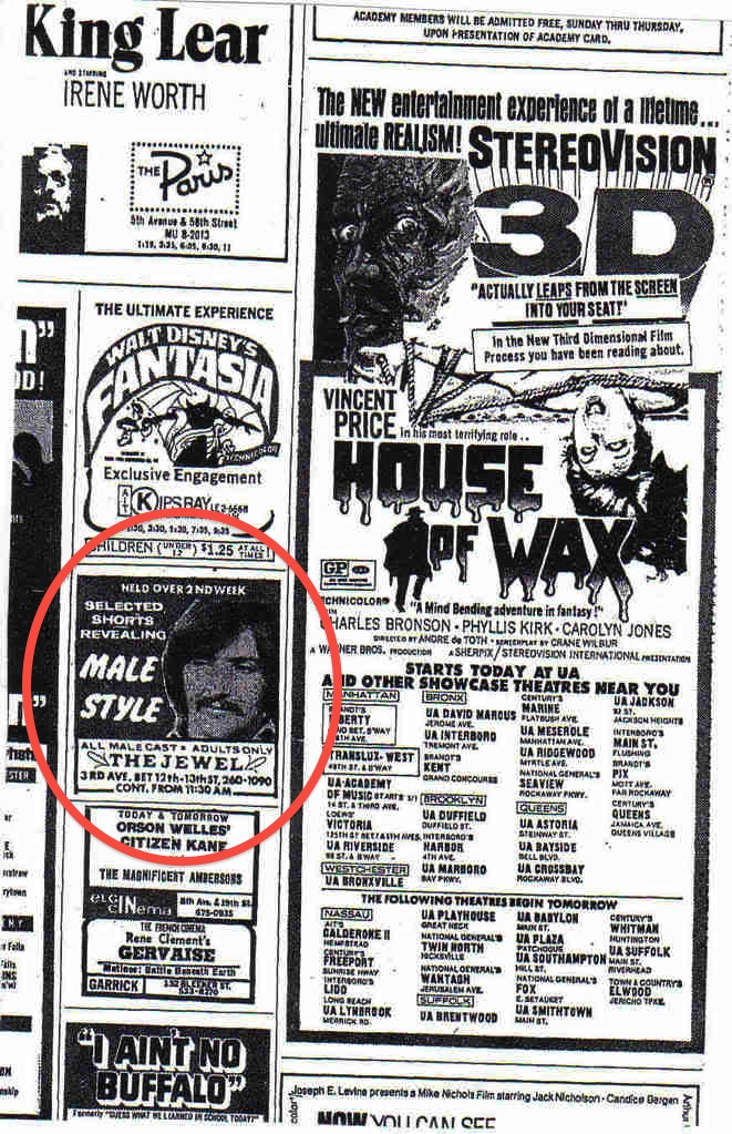 [NYPL]According to Cinema Treasures, it became the Jewel Theatre, which played all male films, in the 1960s. Some Cinema Treasure commenters posted movies ads for the theater.