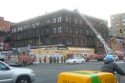 Just after 3, the corner of Bowery and Houston was the scene of chaos! Enough equipment to put out the inferno at the Towering Inferno! Fire trucks! Ladders! Firefighters! Drivers trying to turn right onto Bowery and honking their horns!
