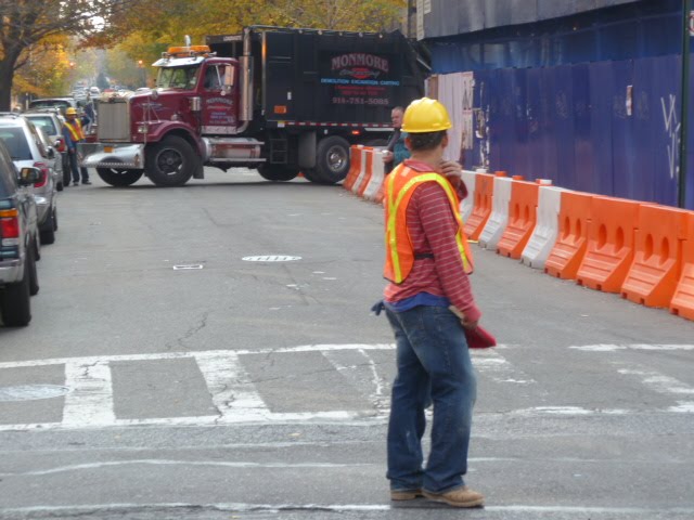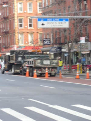 An EV Grieve reader sends along this (admittedly, blurry) photo of the First Avenue bus lane... asking if they city will issue this work crew a fine for blocking the bus lane...