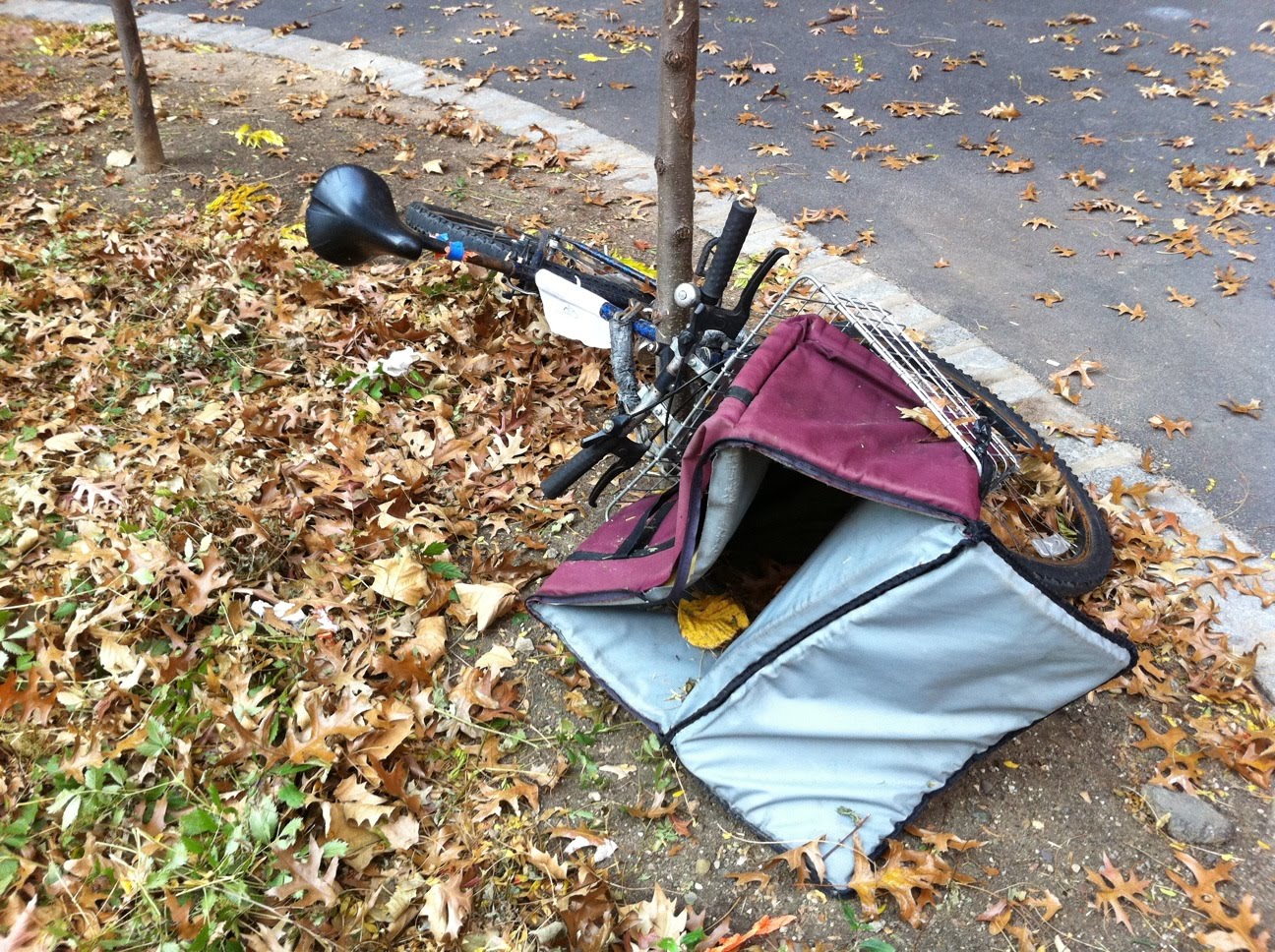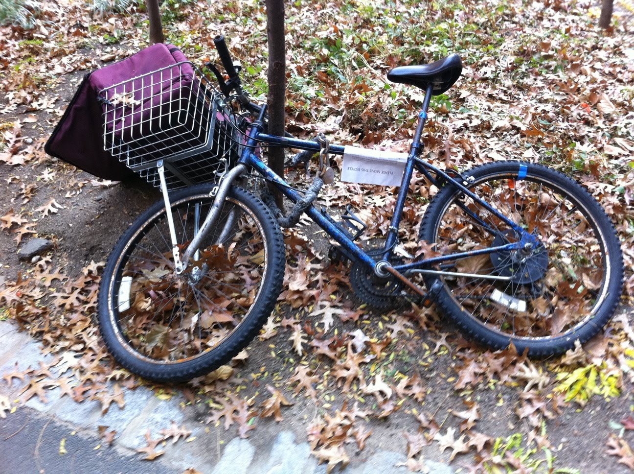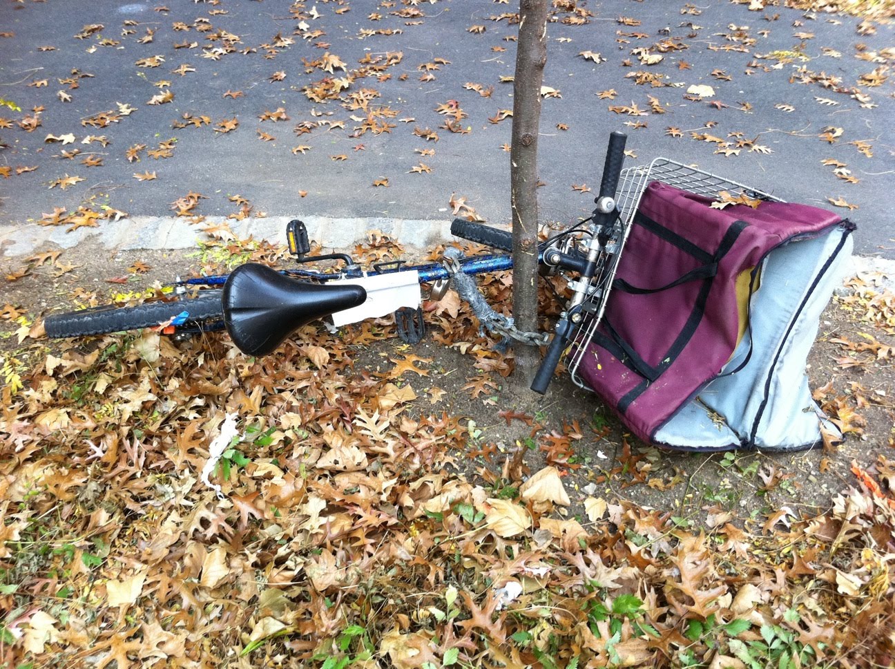 EV Grieve reader Nixta sends along these photos of an abandoned restaurant delivery bike that has been locked to this tree in 4 Stuyvesant Oval in Stuy Town since.... Halloween!