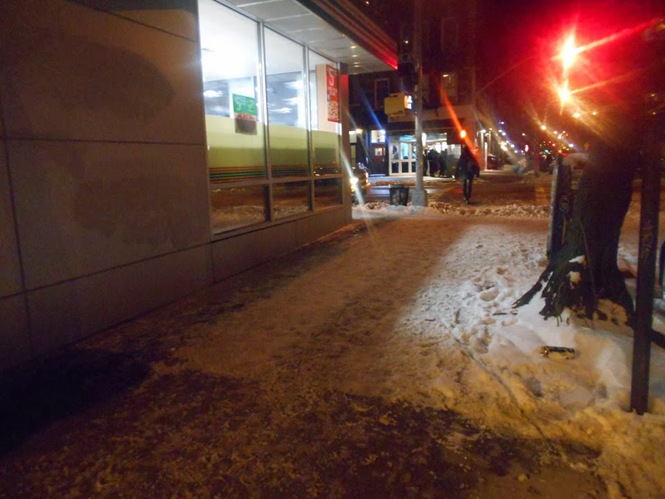 As you may have noticed, it snowed — a lot — on Tuesday … late into the night… And now it's just cold, icy, miserable (mostly!). Meanwhile, residents who live around the newish 7-Eleven on Avenue A and East 11th Street are annoyed that the sidewalks surrounding the store haven't been shoveled or salted… The photos here are from last night…